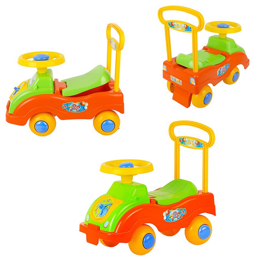Каталка-машинка представляет собой пластиковый толокар в виде яркого автомобиля обтекаемой формы с мощным основанием и рулевым управлением. Оснащена музыкальным модулем. Она проста и удобна в управлении: необходимо поворачивать руль и отталкиваться ногами. Прочная пластиковая рама имеет небольшой вес, а широкие колеса гарантируют устойчивость. Такая каталка способствует развитию опорно двигательного аппарата ребенка, укреплению суставов и координации в пространстве. Катание на таком толокаре для ребенка будет одновременно увлекательным и абсолютно безопасным. Четыре широких колеса из пластика делают машину устойчивой к опрокидыванию, спереди и сзади есть защита от попадания предметов под нее. Руль поворачивается на 2 стороны. Машинка -