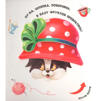 - на каждом развороте — добрый стишок и вращающийся элемент, благодаря которому одна забавная и милая фигурка становится другой;