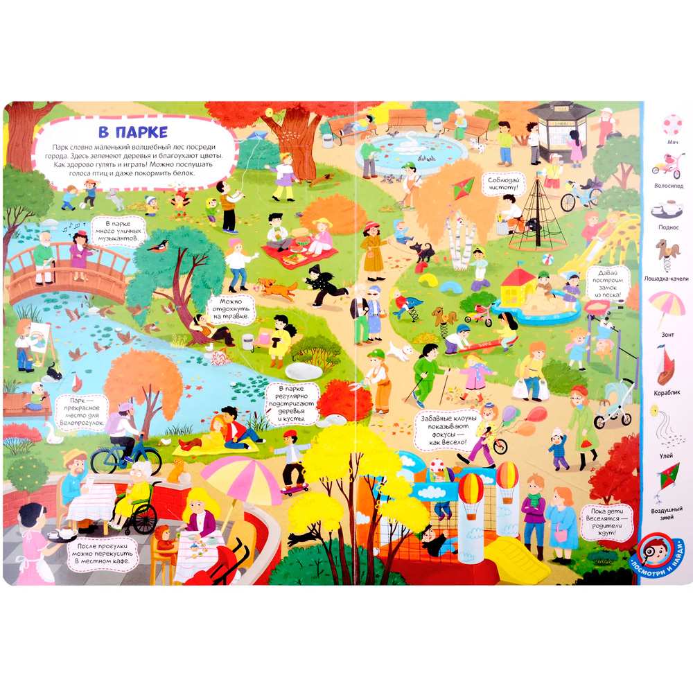 Можно рассматривать картинки, придумывать истории, искать загаданные предметы, находить похожие картинки.
