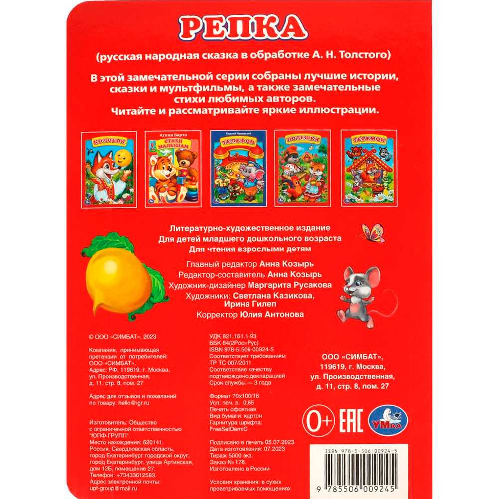 Ярко проиллюстрированная книжка-картонка содержит увлекательную русскую народную сказку для малышей - «Репка» в обработке А.Н. Афанасьева.