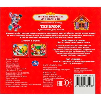 Сказка "Теремок" понравится малышам, ведь она очень интересная и поучительная. Книга издана в серии "Книжка-панорамка" и снабжена красочными панорамными иллюстрациями, которые сделают процесс чтения еще более интересным и увлекательным. На каждом развороте раскрываются объемные панорамные конструкции, и любимые персонажи оживают, а книжка превращается для малыша в настоящий театр. Чтение способствует развитию образного мышления и фантазии, побуждает к действиям, учить этикету и дает первые базовые понятия и сведения об окружающем мире.