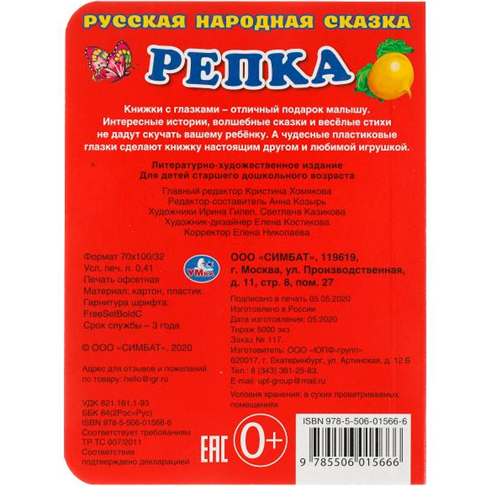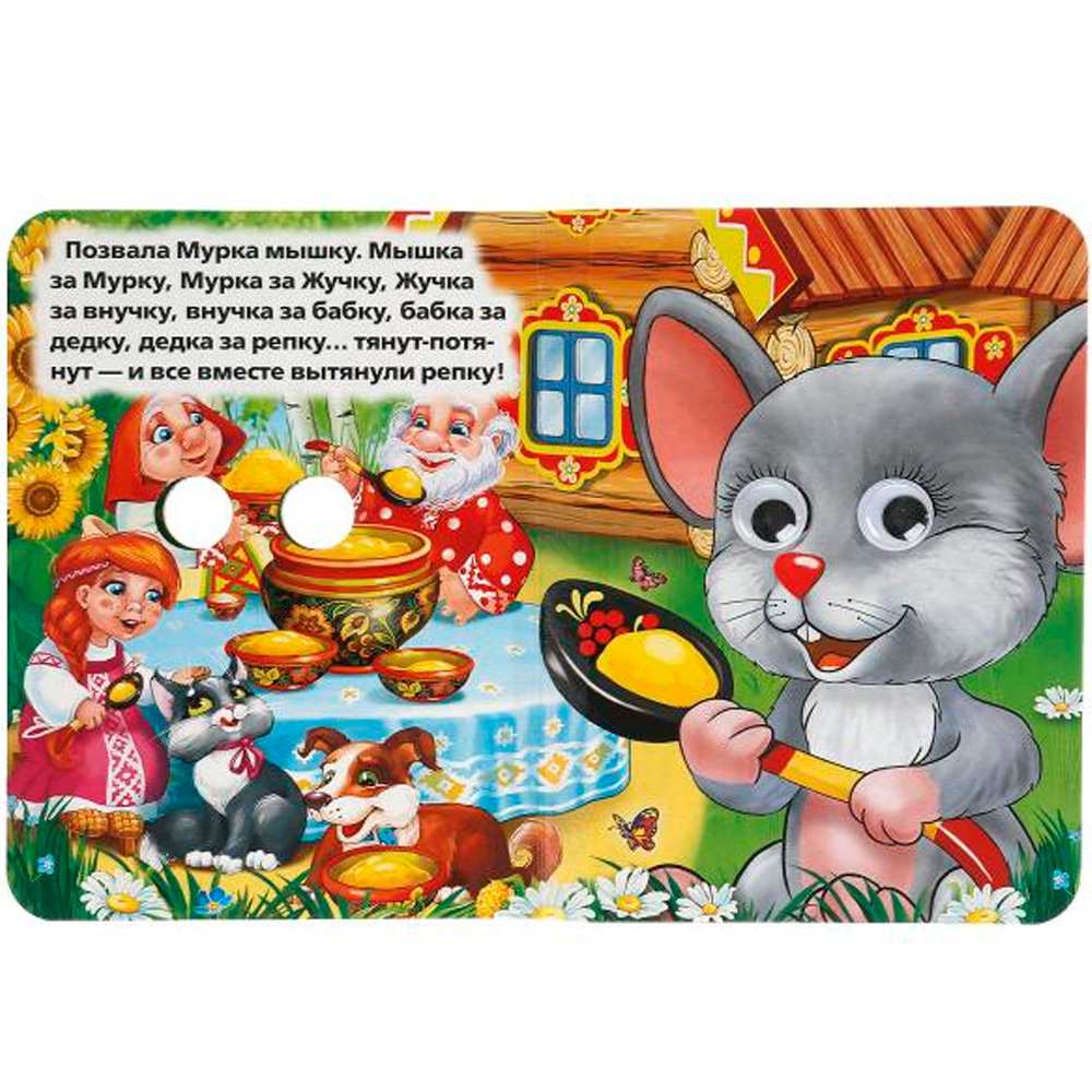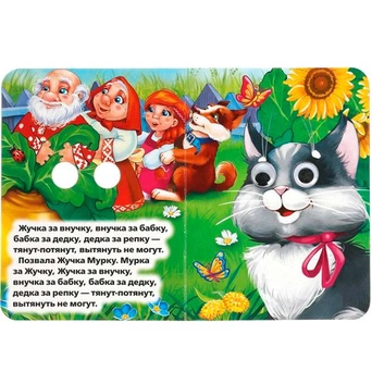 На каждой странице у героев на месте глаз - прорези, на последней странице - пластиковые глазки с подвижными зрачками.