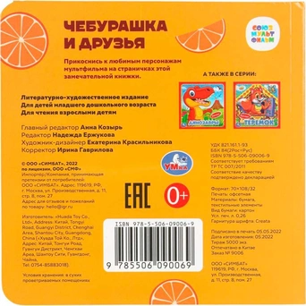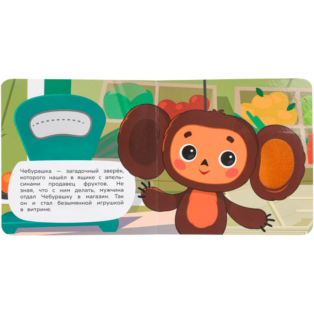 Картонная книга с тактильными элементами «Чебурашка» ТМ «УМка» станет прекрасным подарком для маленького поклонника мультфильмов студии «Союзмультфильм»
