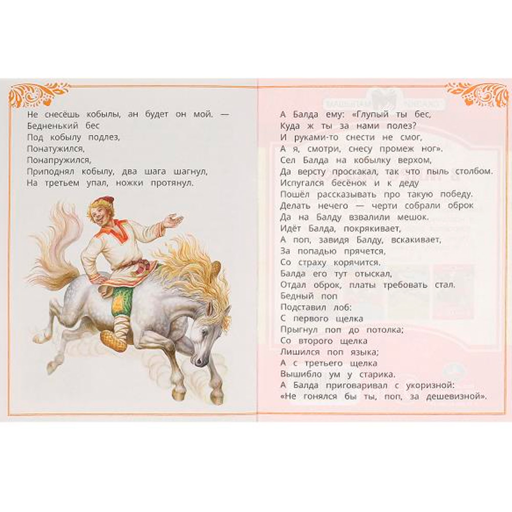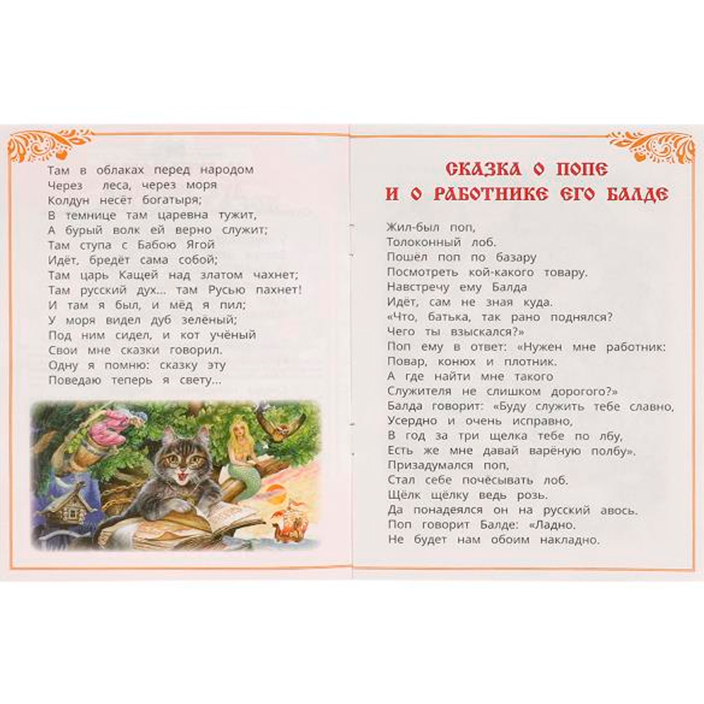 В издании представлены отрывок «У Лукоморья дуб зелёный» и «Сказка о попе и о работнике его Балде» классика русской литературы Александра Пушкина.