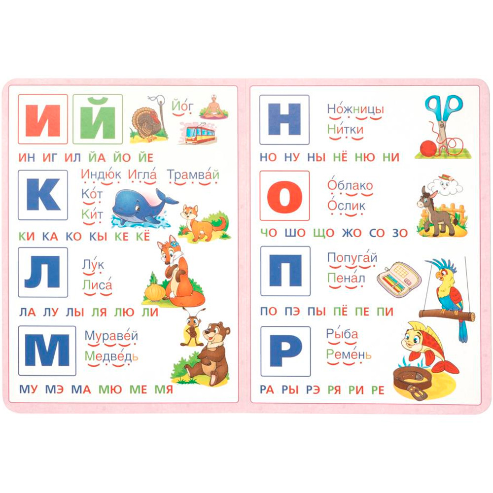 Ярко проиллюстрированная книжка-картонка познакомит малышей с буквами русского алфавита и научит читать по слогам.
