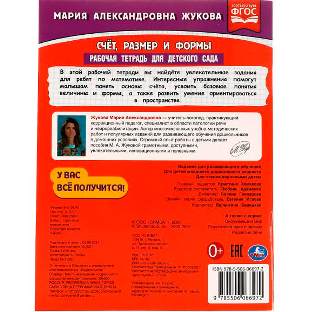 Рабочая тетрадь для детского сада «Счёт, размер и формы» от ТМ «УМка» предназначена для детей старшего дошкольного возраста.