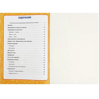 Книжка затрагивает различные темы с учётом возрастных особенностей детей: букварь, профессии, времена года, предметный мир, решаем примеры, чтение по слогам, противоположности.
