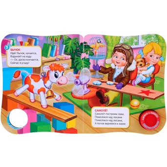 Книжка с музыкальным модулем содержит веселые стихи и песенки. На обложке имеется тактильный элемент. Звуковой модуль активируется при нажатии на кнопку. Текст сделан крупным, чтобы дети постарше могли научиться читать его. Книга сделана из плотного картона и качественно иллюстрирована. Такую книгу будет очень интересно читать и разглядывать, а также развивать мелкую моторику и цветовое восприятие. Книжка небольшого размера, ее очень удобно держать в руках. Издание имеет безопасный и удобный формат. Чтение способствует тренировке памяти, усидчивости, слухового и зрительного восприятия, мелкой моторики рук.