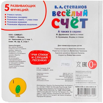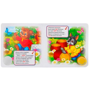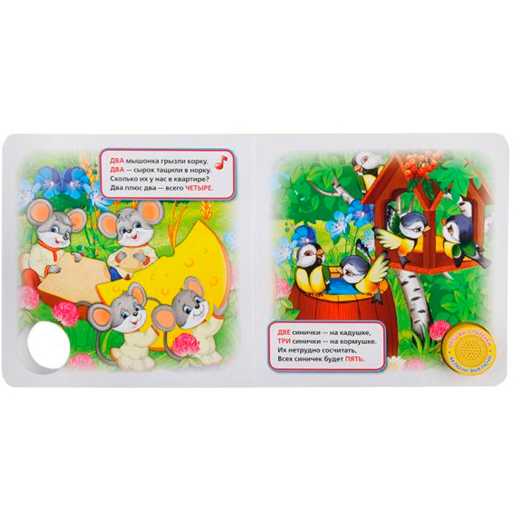 Книжка с вырубкой и кнопкой познакомит малышей с цифрами и счетом. Она содержит занимательные стихи. Книга расширяет кругозор малыша, тренирует слух, развивает внимание и память. Дети хорошо улавливают ритм, поэтому песенки для них — прекрасный вариант. Яркие картинки привлекут внимание, а юмористические строчки - позабавят и развлекут. При нажатии на кнопку раздается веселая песенка. Текст адаптирован для самых маленьких читателей.