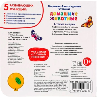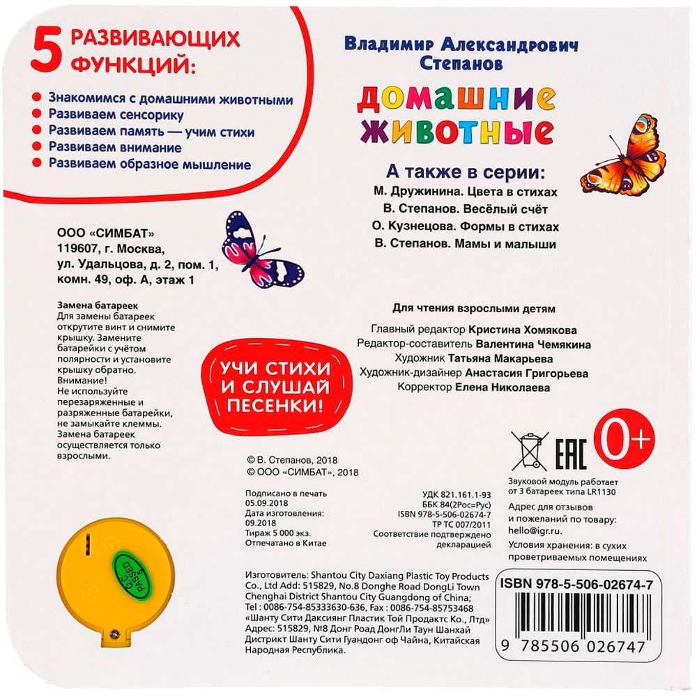 Яркая картонная книжка содержит веселые стихи. Книжка с музыкальным модулем и кнопкой позволит малышу занимательно провести время. Звуковой модуль активируется при нажатии на кнопку и позволяет прослушать веселую песенку. Текст сделан крупным, чтобы дети постарше могли научиться читать его. Книга изготовлена из плотного картона и качественно иллюстрирована. Такую книгу будет очень интересно читать и разглядывать, а также развивать мелкую моторику и цветовое восприятие. Книжка небольшого размера, ее очень удобно держать в руках. Издание имеет безопасный и удобный формат. Чтение способствует тренировке памяти, усидчивости, слухового и зрительного восприятия, мелкой моторики рук.