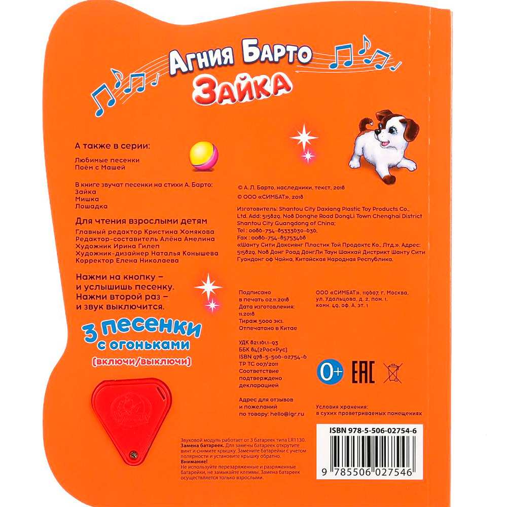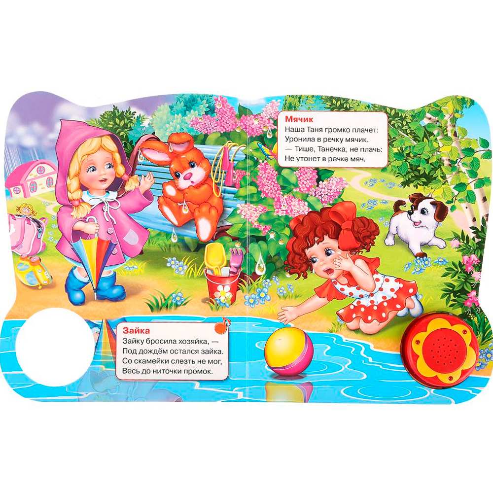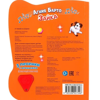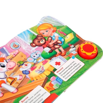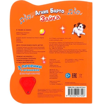 Яркая картонная книжка содержит веселые стихи. Кроме того, книжка оснащена световым модулем - яркими огоньками. Книжка с музыкальным модулем и кнопкой позволит малышу занимательно провести время. Звуковой модуль активируется при нажатии на кнопку и позволяет прослушать веселую песенку. Текст сделан крупным, чтобы дети постарше могли научиться читать его. Книга изготовлена из плотного картона и качественно иллюстрирована. Такую книгу будет очень интересно читать и разглядывать, а также развивать мелкую моторику и цветовое восприятие. Книжка небольшого размера, ее очень удобно держать в руках. Издание имеет безопасный и удобный формат. Чтение способствует тренировке памяти, усидчивости, слухового и зрительного восприятия, мелкой моторик