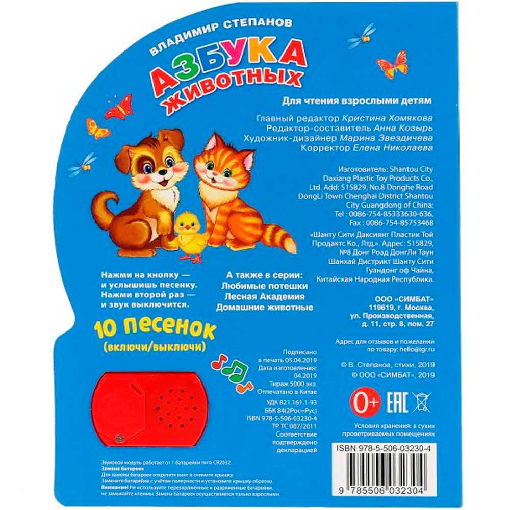 Книжка с музыкальным модулем содержит зстихи о животных и песенки. Звуковой модуль активируется при нажатии на кнопку. Текст сделан крупным, чтобы дети постарше могли научиться читать его. Книга сделана из плотного картона и качественно иллюстрирована. Такую книгу будет очень интересно читать и разглядывать, а также развивать мелкую моторику и цветовое восприятие. Книжка небольшого размера, ее очень удобно держать в руках. Издание имеет безопасный и удобный формат. Чтение способствует тренировке памяти, усидчивости, слухового и зрительного восприятия, мелкой моторики рук.