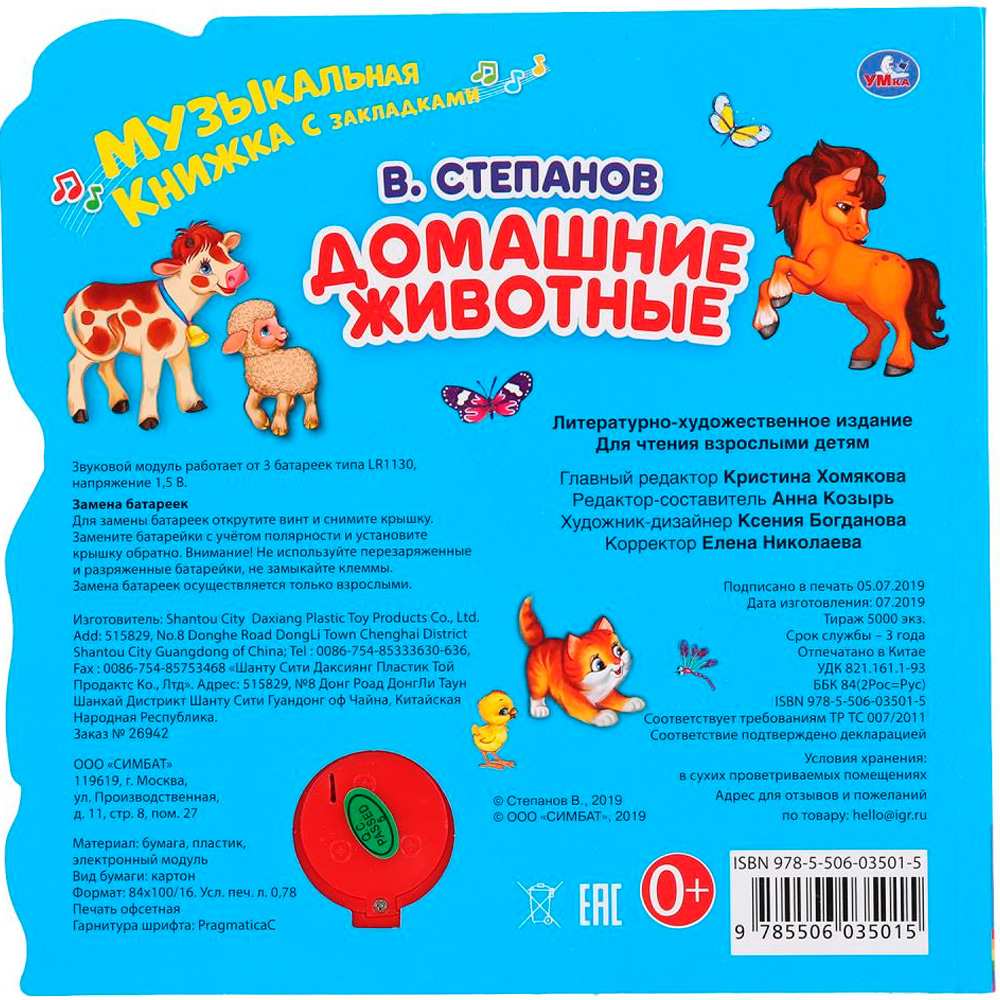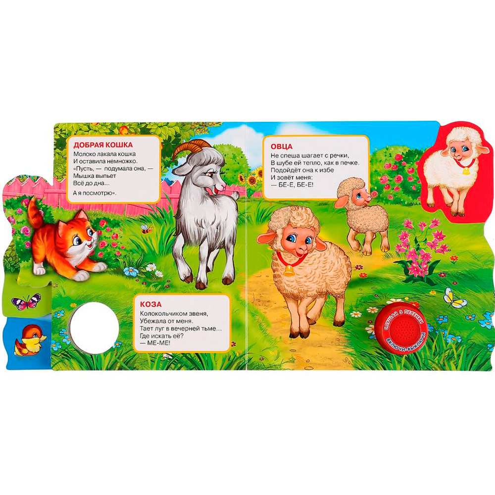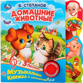 Красочная книжка содержит веселые песенки, яркие картинки, стихи и познакомит малышей с домашними животными. Звуковой модуль активируется при нажатии на кнопку. Книга выполнена из плотного картона и ярко иллюстрирована. Такую книгу будет очень интересно читать и разглядывать картинки, а также тренировать мелкую моторику и цветовое восприятие. Книжкаобладает удобным форматом. Издание имеет безопасный и удобный формат. Чтение способствует тренировке памяти, усидчивости, слухового и зрительного восприятия, мелкой моторики рук.