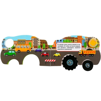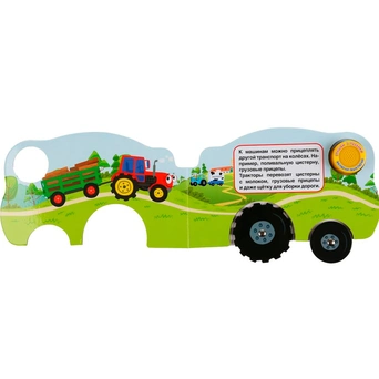 Красочная книжка содержит веселые песенки, яркие картинки, стихи и познакомит малышей с разныи видами транспорта. У книжки есть колесики, так что с ней еще можно и поиграть. Звуковой модуль активируется при нажатии на кнопку. Книга выполнена из плотного картона и ярко иллюстрирована. Такую книгу будет очень интересно читать и разглядывать картинки, а также тренировать мелкую моторику и цветовое восприятие. Книжкаобладает удобным форматом. Издание имеет безопасный и удобный формат. Чтение способствует тренировке памяти, усидчивости, слухового и зрительного восприятия, мелкой моторики рук.