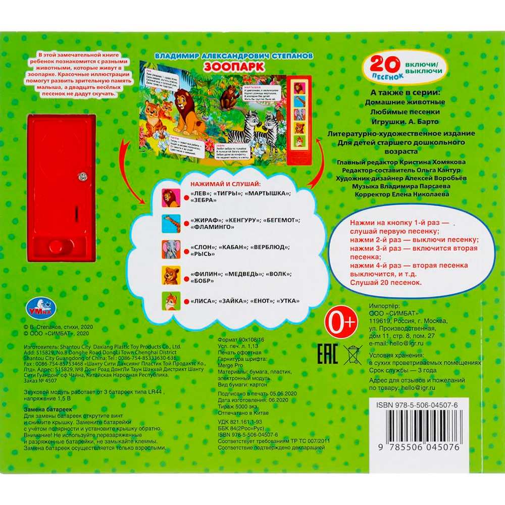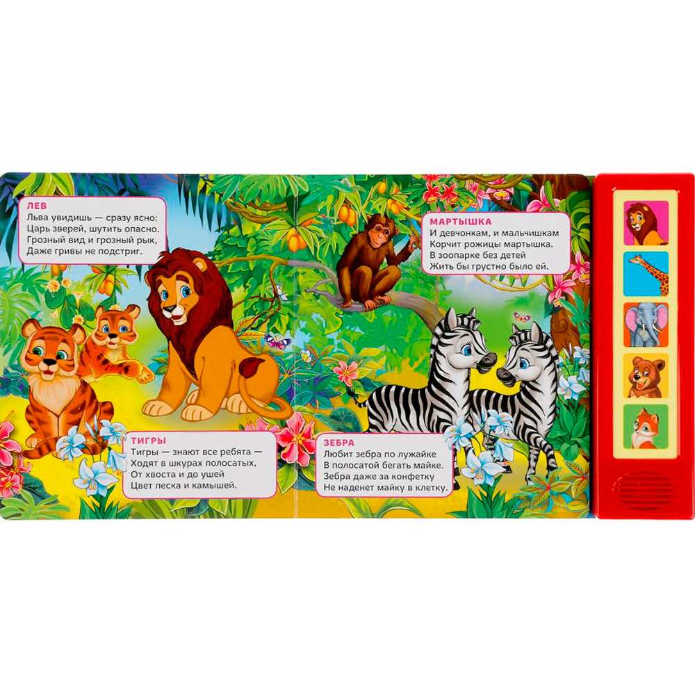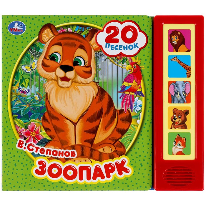 • Книжка с музыкальным модулем содержит занимательные стихи о животных и 20 песенок: «Лев», «Тигры», «Мартышка», «Зебра», «Жираф», «Кенгуру», «Бегемот», «Фламинго», «Слон», «Кабан» и др.