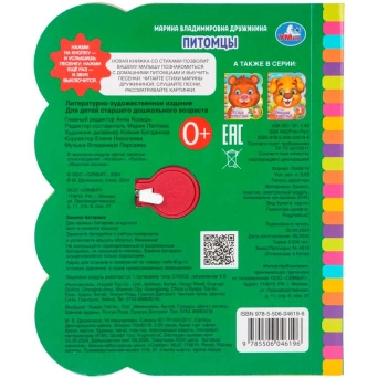 Музыкальная книга «М. Дружинина. Питомцы» станет отличным развивающим подарком для малышей дошкольного возраста. Ребёнок с большим интересом будет листать мягкие странички, рассматривать веселые картинки, читать вместе с родителями интересные стихотворения о домашних питомцах.