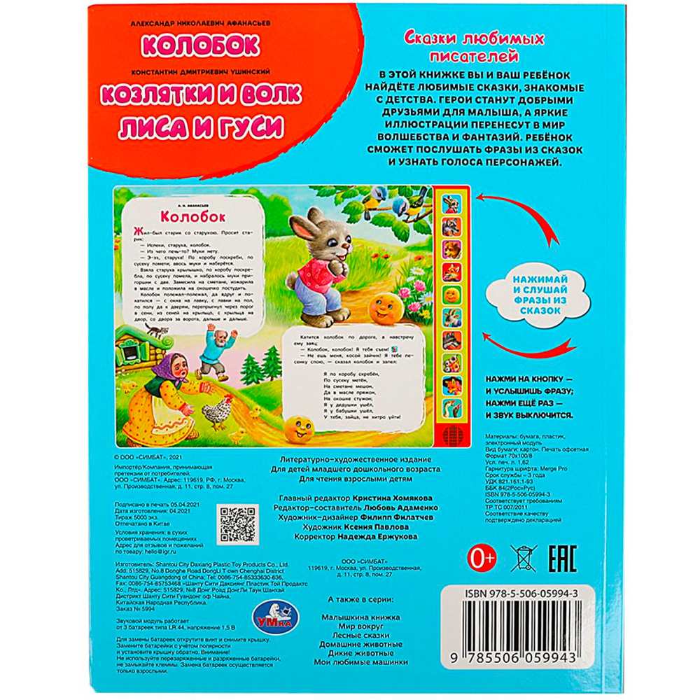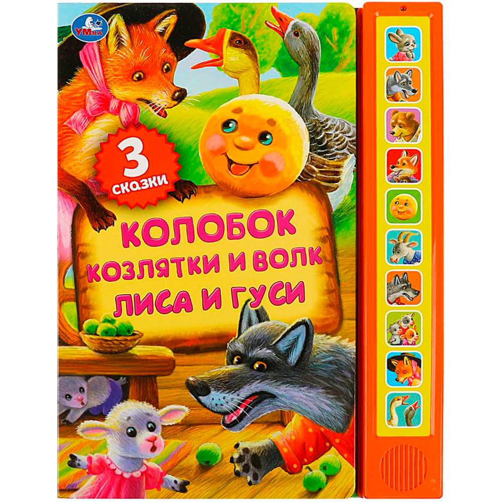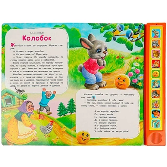 Книжка с музыкальным модулем содержит 3 увлекательные сказки: «Колобок», «Козлята и Волк», «Лиса и гуси», а 10 звуковых кнопок позволят послушать песенки.