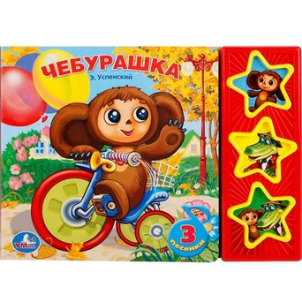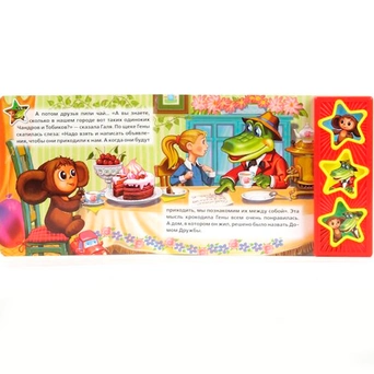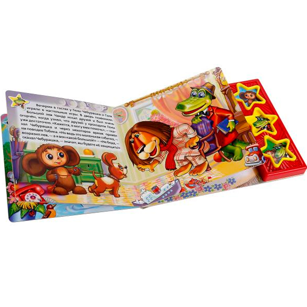 Книга посвящена известным российским мультипликационным персонажам — Чебурашке и крокодилу Гене. Друзья ходят в гости, развлекаются и просто весело проводят время. Родители могут зачитывать занимательную историю, в то время как малыш будет обогащать свой словарный запас, воображение и память, попутно с интересом разглядывая красочные картинки из книги. Текст адаптирован для самых маленьких читателей. Книжка небольшого размера, ее очень удобно держать в руках. Странички изготовлены из плотного картона, так что помять или порвать ее будет не так просто. В издании имеются звуковые кномпи в виде звезд, нажав на которые, можно послушать песенку из мультфильма и услышать голоса любимых героев. При повторном нажатии на кнопку песенка останавливается. Такую кни