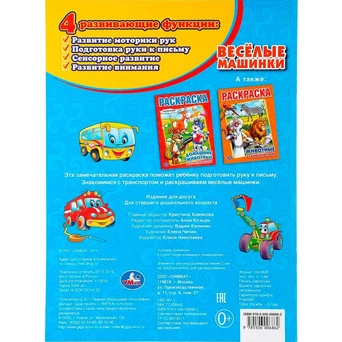Книга содержит картинки для раскрашивания и интересные задания. Это увлекательное занятие стимулирует мелкую моторику, развивает аккуратность и внимание ребёнка, а весёлые и интересные задания расширяют его кругозор. Книга привлекает внимание своим ярким и красочным оформлением. Раскрашивание формирует усидчивость и координацию движений. Раскрашивание полезно для малышей. Они получат представление о форме и цвете, освоят навыки владения карандашом и кистью, познакомятся с различными материалами для раскрашивания. В процессе раскрашивания происходит тренировка коррдинации рук и мелкой моторики, что важно для полноценного развития ребенка. А еще - это отличный способ занять малыша и весело провести время.