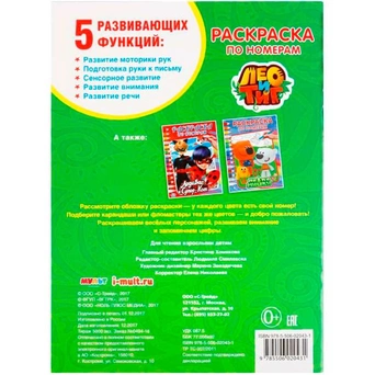 Раскраска по номерам - оригинальный подарок юным художникам. Она содержит крупные рисунки, которые несложно раскрасить. Нужно рассмотреть обложку раскраски - у каждого цвета есть свой номер. Необходимо подобрать карандаши или фломастеры тех же цветов и можно начинать творить. Раскрашивание полезно для малышей. Они получат представление о форме и цвете, освоят навыки владения карандашом и кистью, познакомятся с различными материалами для раскрашивания. В процессе раскрашивания происходит тренировка коррдинации рук и мелкой моторики, что важно для полноценного развития ребенка. А еще - это отличный способ занять малыша и весело провести время.