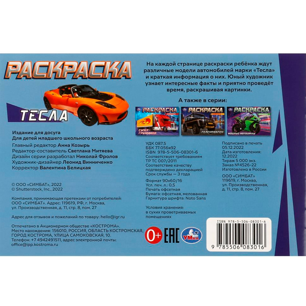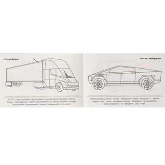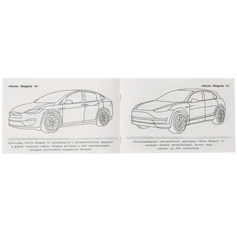 Книжка содержит картинки машинок для раскрашивания карандашами, фломастерами или красками.