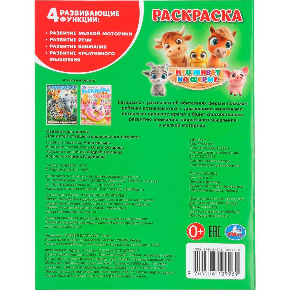 Раскраска «Кто живёт на ферме» от ТМ «УМка» поможет вашему ребёнку узнать больше о животных и развить творческие способности.
