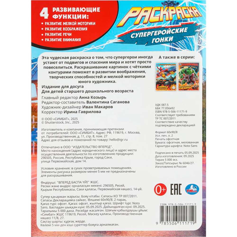 Раскраска «Супергеройские гонки» ТМ «УМка» обязательно понравится юным художникам.