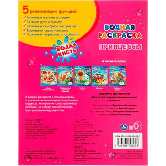 Водная раскраска со сказкой - прекрасная альтернатива краскам, ведь такое раскрашивание требует только кисть и воду и не оставляет следов. В процессе раскрашивания картинок водой проступают яркие цвета. Такое чудесное преображение точно понравится малышам. Такие книжки удобно брать в дорогу. Книга содержит 8 картинок для раскрашивания и сказку.