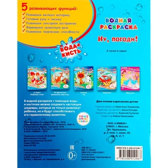 Водная раскраска - прекрасная альтернатива краскам, ведь такое раскрашивание требует только кисть и воду и не оставляет следов. В процессе раскрашивания картинок водой проступают яркие цвета. Такое чудесное преображение точно понравится малышам. Такие книжки удобно брать в дорогу. Книга содержит несколько картинок для раскрашивания. С помощью воды и кисточки можно создавать настоящие шедевры, которые не только развлекут ребенка, но и будут способствовать его гармоничному развитию.