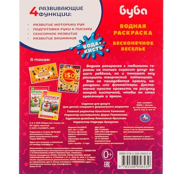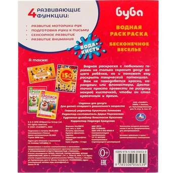 Водная раскраска - прекрасная альтернатива краскам, ведь такое раскрашивание требует только кисть и воду и не оставляет следов. В процессе раскрашивания картинок водой проступают яркие цвета. Такое чудесное преображение точно понравится малышам. Такие книжки удобно брать в дорогу. Книга содержит несколько картинок для раскрашивания. С помощью воды и кисточки можно создавать настоящие шедевры, которые не только развлекут ребенка, но и будут способствовать его гармоничному развитию.