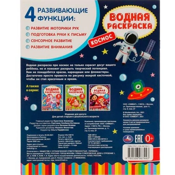 Водная раскраска «Космос» от ТМ «УМка» понравится малышам и скрасит их досуг. Для раскрашивания не понадобятся краски, карандаши или фломастеры - достаточно просто провести по рисунку мокрой кисточкой, чтобы он стал красочным и ярким.