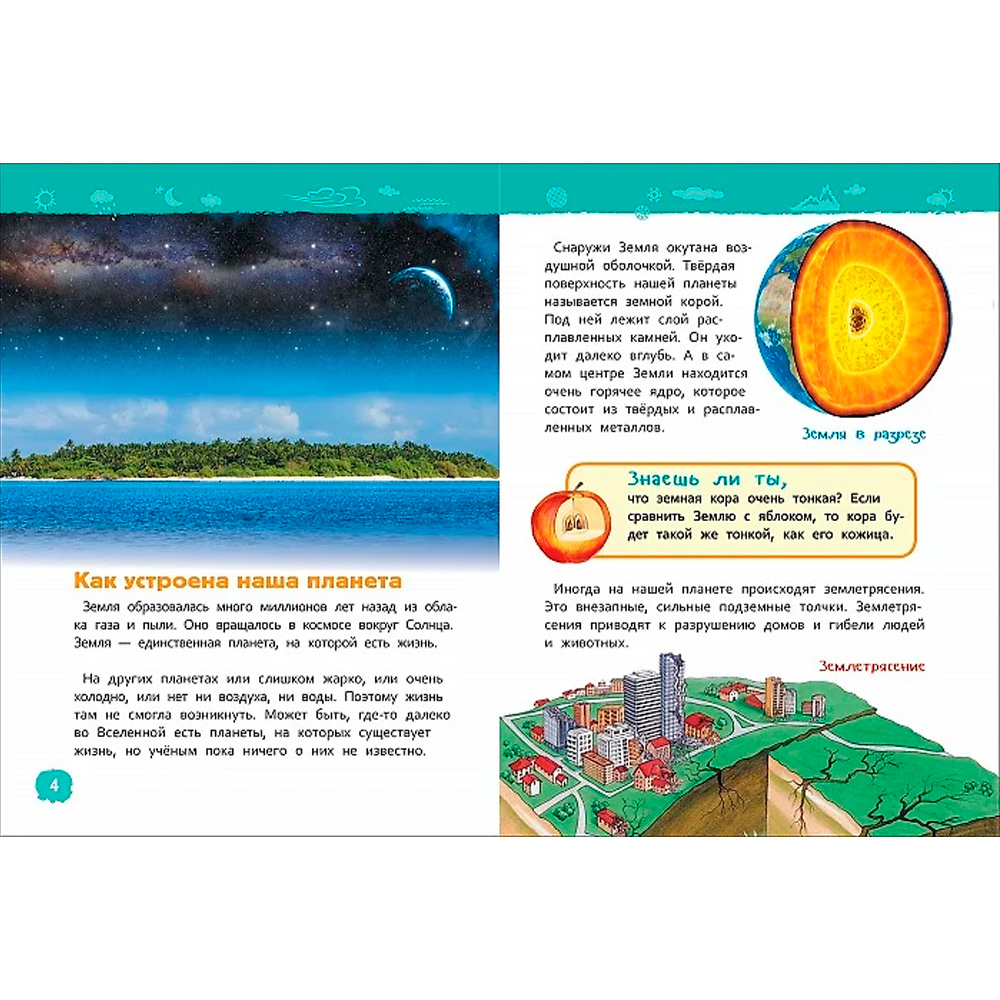 Книга "Планета Земля" поможет ребенку получить знания об окружающем мире, о том, как устроена Вселенная и наша планета, какие животные и растения есть на Земле, а также о том, как работают привычные нам вещи. Он узнает, что такое материки и океаны, кто населяет сушу и морские глубины. Его увлечет рассказ о том, как образуются облака, почему идет дождь, день сменяется ночью, а после зимы наступает весна. Издание рассчитано на детей от 5 лет и содержит множество вопросов и интересных заданий.