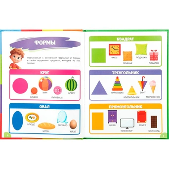 Маленькие читатели изучат цвета и формы, овощи и фрукты, домашних и диких животных и много другое.
