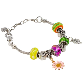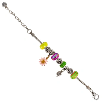 Браслет имеет стильный дизайн и будет аккуратно смотреться на ручке. Изделие украшено разноцветными шармами и оригинальными кулонами-подвесками. Застегивается на крепкий замочек. Носить браслет можно с любой одеждой.