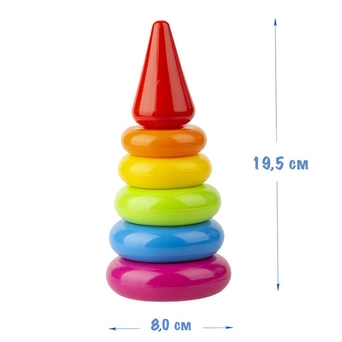 Пирамидка представляет собой набор постепенно уменьшающихся по величине разноцветных колец, надеваемых на стержень.