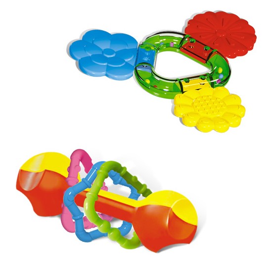 Красочный набор погремушек - это замечательный подарок для малыша. В набор входит две погремушки. Одна из них в виде колечка с цветочками-прорезывателями, а вторая похожа на маленькую гантельку с пластиковыми фигурами на ней. Играя с ними, малыш развивает пространственное и слуховое восприятие, учится наблюдать за движением и находить источник звука.