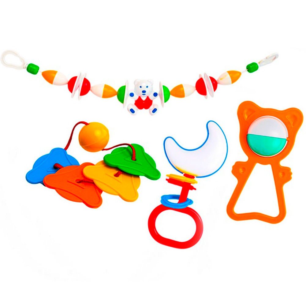 Яркий набор погремушек привлечет внимание малыша, и станет отличным подарком.