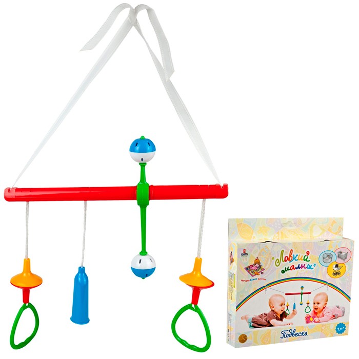 Подвеска Ловкий малыш является не просто развивающей игрушкой, но и своеобразным тренажером. На специальной полочке подвешены разные погремушки-хваталки, за которые можно держаться и учиться самостоятельно вставать. Малышу обязательно понравится яркая подвеска на кроватку. Малыш будет пытаться дотянуться до нее, потрогать, понять откуда идет звук. Игрушка развивает моторику, слух, зрение.Все погремушки закреплены на пластиковой полочке длиной 31 см, которая крепится к кроватке при помощи веревок.