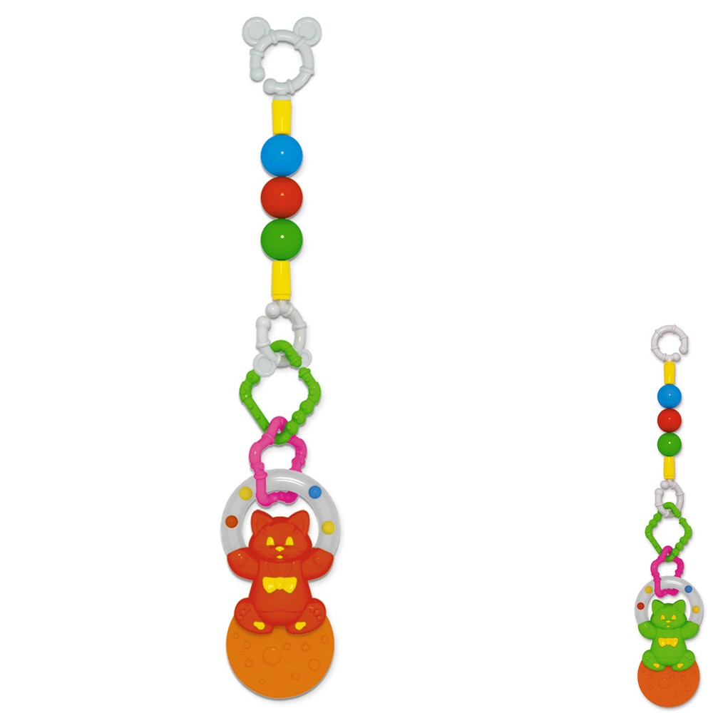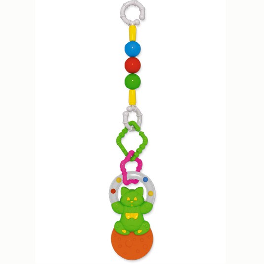 Красочная подвеска с яркими элементами и фигуркой котика - это замечательный подарок для малыша. Погремушку можно прикрепить на коляску или кроватку - для этого предусмотрены специальное крепление. Игрушка разбирается, что будет интересно малышам постарше. Также она издает звук от находящихся внутри элементов.