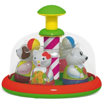 Юла-карусель «Аттракцион» - это развивающая игрушка для самых маленьких. Она напоминает детский аттракцион в парке с катающимися на нем зверушками. Малыш сам сможет запускать юлу-карусель и влиять на скорость вращения карусели, нажимая на большую кнопку сверху. После запуска зверушки в ярких костюмах начинают вращаться, привлекая внимание малыша. Под куполом юлы на прозрачной площадке находятся разноцветные шарики, которые при движении выкатываются к стенке купола, а при остановке возвращаются на свои места.