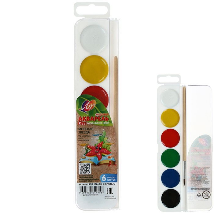 Комплектация: акварель - 1 палетка (6 цв.), кисть - 1 шт.