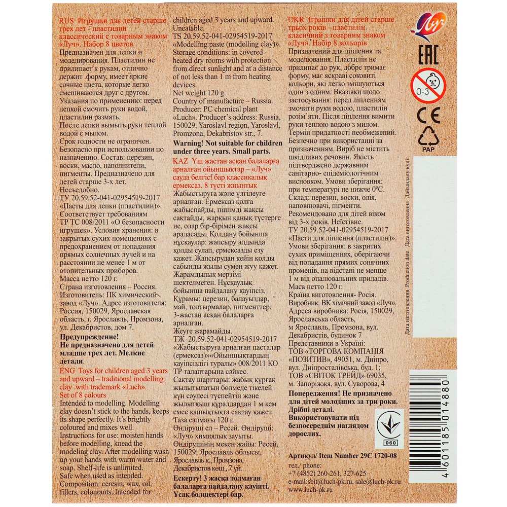 Комплектация: пластилин - 8 цветовМатериал: картон, пластилин