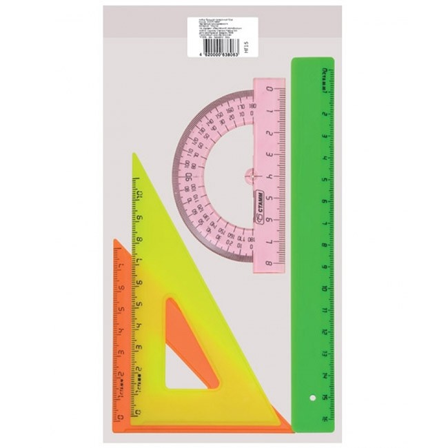 Комплектация: линейка 16 см, транспортир, два треугольникаМатериал: полистирол