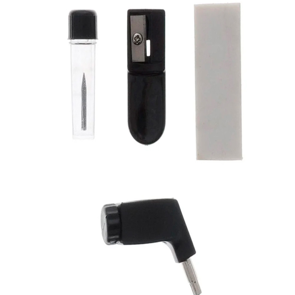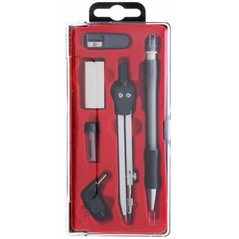 Комплектация: футляр - 1 шт., циркуль - 1 шт., пенал с запасным грифелем - 1 шт., точилка - 1 шт., ластик - 1 шт., карандаш - 1 шт.