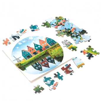 Пазл представляет собой картинку, состоящую из некрупных деталей разной формы, соединяющихся замком, который делает конструкцию прочной.