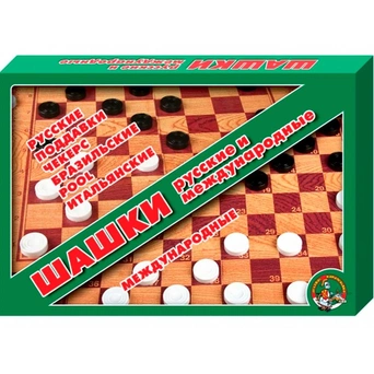 Комплектация: 1 двустороннее поле, 40 пластмассовых шашек.Материал: картон, пластик