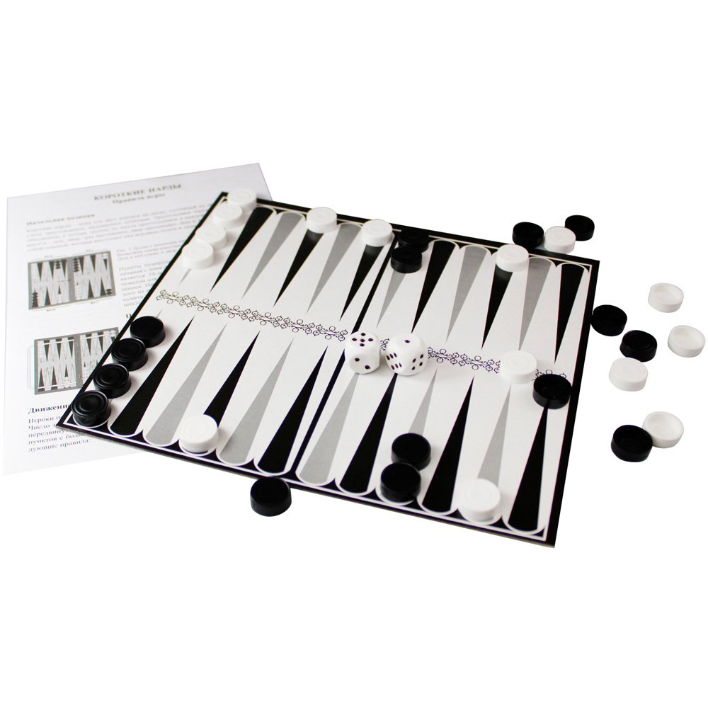 Комплектация: 24 шашки (12 черных и 12 белых), игровые кубики, игровое поле, правилаМатериал: пластик, картон