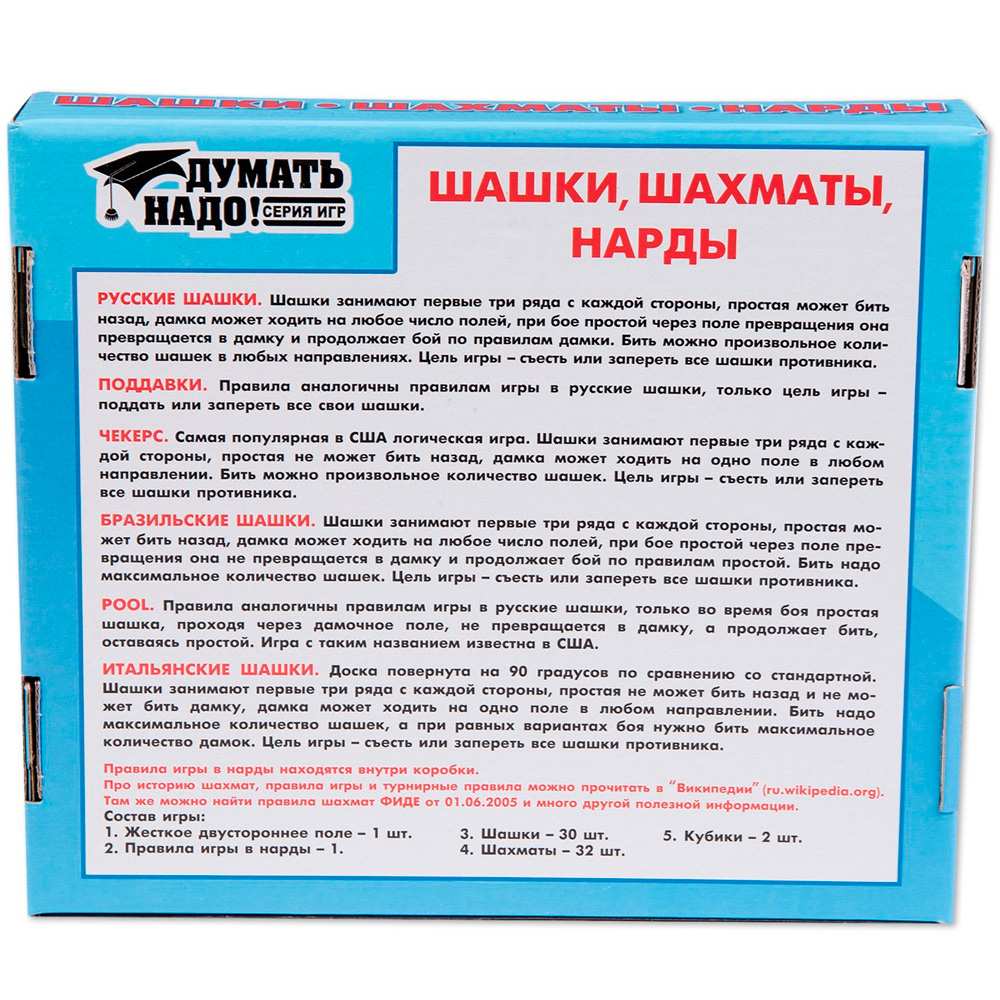 Комплектация: жесткое двустороннее поле, маленькие пластмассовые шашки - 30 шт (15 белых и 15 черных), небольшие пластмассовые шахматные фигурки 32 шт. (16 белых фигур и 16 черных), 2 кубика, правила игры в нарды.Высота шахматных фигурок от 2,5 см (пешки) до 4,5 см (король), диаметр шашки - 1,7 см