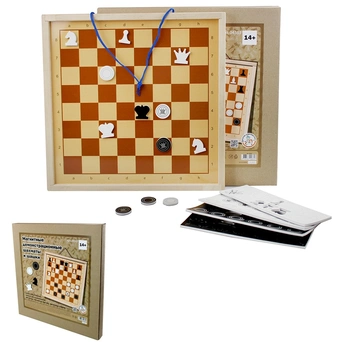 Комплектация: шахматная доска на петлях в деревянной рамке (37 х 37 х 2,5 см), набор шахмат (высота до 3 см, ширина до 3 см) 36 шт, набор шашек (диаметр 3 см, толщина 0,4 см) 34 шт.