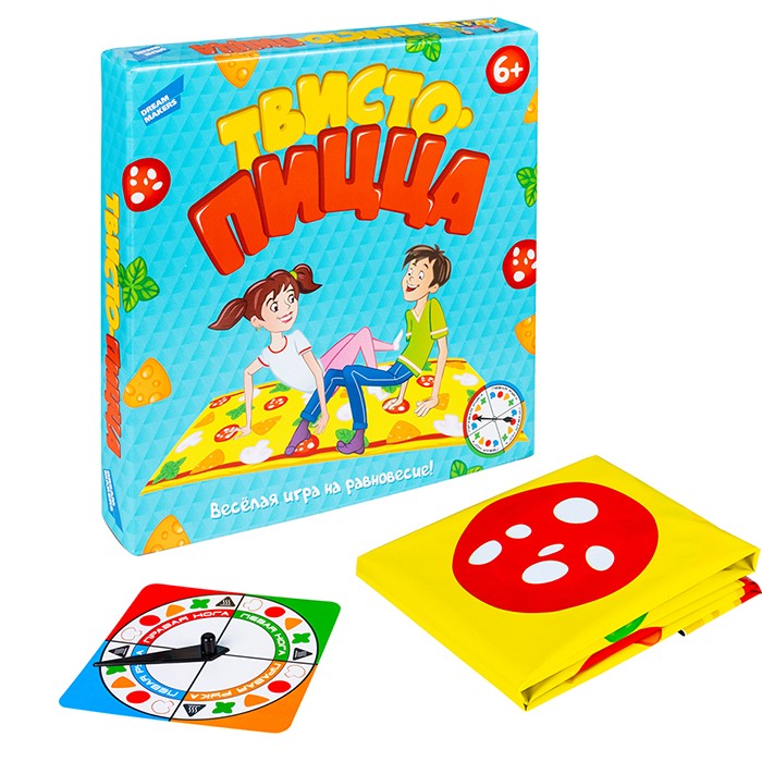 «Твисто-Пицца» от DREAM MAKERS – это весёлая настольная игра для всей семьи и любой дружной компании, в которой игроки поочерёдно ставят руки или ноги на цвета игрового коврика и пытаются удержать равновесие. Игровой коврик имеет достаточно большой размер (170 х 110 см) и выполнен в виде пиццы. Игра развивает ловкость, координацию движений, логическое мышление.
